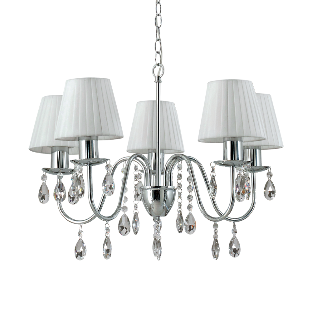 Línea de arañas de 3 y 5 luces, con caireles y pantalla de tela para lámpara E27.
